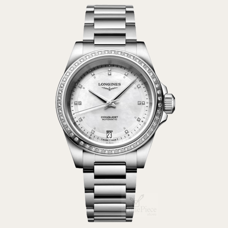LONGINES L3.430.0.87.6 ladies watch from the Conquest collection has a 34 mm diameter, 17 mm thickness case.