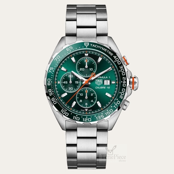 It has a green dial, paired with stainless steel bracelet.