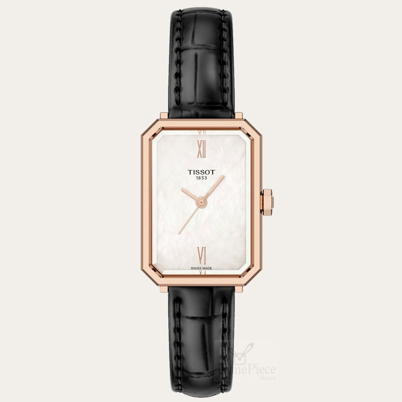 It has a white mother-of-pearl dial, paired with black leather strap.